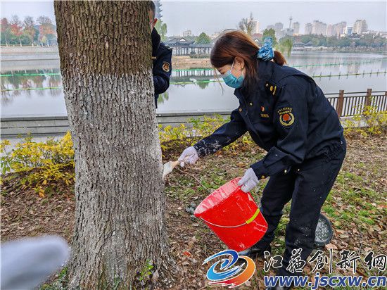 在葛仙湖公园活动现场,城管局的党员干部职工、志愿者们在园林工人的专业指导下按照要求配比好石灰水,手持小桶和刷子,对每棵树木进行刷白,确保每一棵树都均匀涂到位、刷白高度整齐划一。在树木刷白养护的同时,工作人员也及时清理了园区内的垃圾杂物、枯枝落叶,确保树木安全过冬。