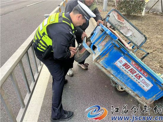 当天傍晚16时50分许,负责230省道巡逻的宜兴市交警大队周铁中队民警陈家霖、辅警周立鑫开着警车准备回单位交班,行至230省道朝阳路口时,发现一位老人爷眉头紧锁,神色紧张,双手颤抖,站在路边,旁边还有一辆侧翻的电瓶三轮车,经下车询问得知,老人半小时前驾驶电瓶三轮车与道路护栏碰撞发生侧翻,当时受了伤,刚从医院回到出事现场。民辅警看到老人的电动三轮车侧翻在路牙旁不好正常行驶,立即从警车里拿出扳手等工具帮助老人义务修车,不一会儿,电动三轮车恢复了使用。