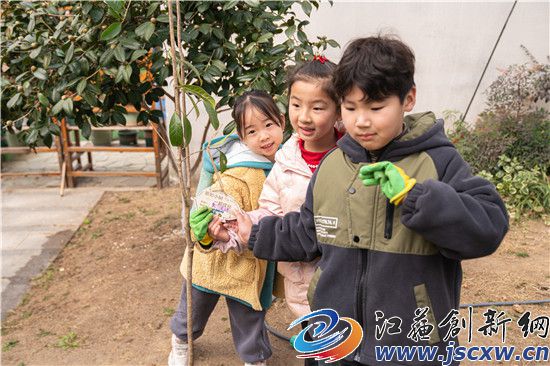 在文昌幼儿园的种植区,大学生志愿者们与小朋友们组队,开启了植树挑战。志愿者们握着小朋友的手,一起扶正树苗、挥锹培土、提水浇灌。每棵树都挂上树牌,上面写着小朋友的班级、植树日期和树的品种。