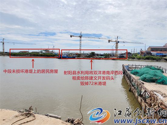陈立飞总经理向媒体介绍道,企业北边 100 米的双洋渔港港堤是重要防护屏障。从有双洋渔港起至今,一直都有港堤防护海水侵蚀,港堤上也一直有渔民居住至今。2012 年,射阳县水利局将港堤西段 72 米租给临海镇居民陈建文 20 年,租金 11 万元,承租人将港堤降近 2 米至地平面以下开发成码头。企业提出质疑遭时任县水利局五岸灌区进排水管理中心主任丁中兵无视。2014 年,丁中兵又将企业对面 92 米港堤租给吕井国开发渔船修造厂,租期 20 年,租金 17 万元,港堤被降近 2 米推平。