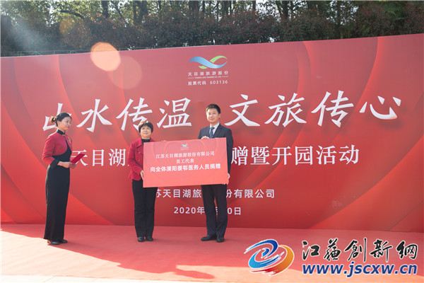 江苏创新网讯 春暖花开,疫后天晴,经历漫长的闭园防疫,3月20日,江苏天目湖景区正式向游客开放,开园首日,景区员工代表开展“山水传温,文旅传心”公益捐赠活动,定向捐赠溧阳援鄂医务人员。活动现场也邀请了援鄂医务人员家庭免费游览天目湖,并在湖畔种植署名纪念树。