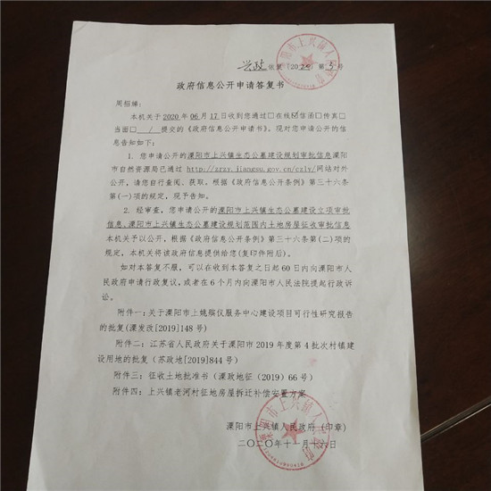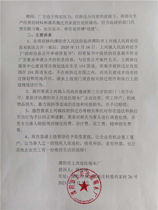 1、在周招娣向溧阳市人民法院起诉溧阳市上兴镇人民政府信息未依法公开一案后,2020年11月16日,上兴镇人民政府给予了“政府信息公开申请答复书”,但答复书中提供的信息都不符合厂方要求申请公开的信息内容,与信息公开案件无关。上姚殡仪服务中心建设项目规划选址东至104国道,而案涉被拆迁征收范围在104国道东边,不在被拆迁范围之内,该项目建设并没有经过规划和用地许可,请求上级部门调查相关拆迁程序和执行上的违规违法行为。
