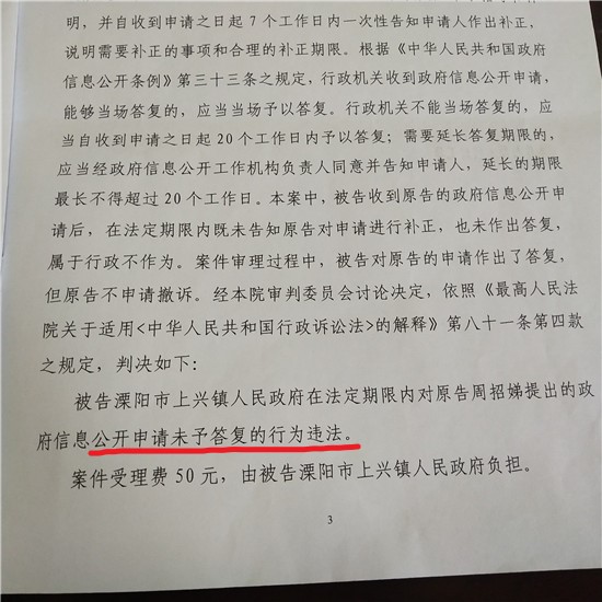 事件发生两年多,因为没有得到合理赔偿,溧阳市上兴连松锯木厂当事人周招娣万般无奈,于2020年6月12日上午9时许,前往镇拆迁办了解相关情况。结果,在咨询过程中,周招娣被负责片区拆迁的工作人员展某抢夺手机,推倒在地并导致左膝部受伤。经溧阳市公安局溧公物鉴(法检字)【2020】401号鉴定为“轻微伤”。2020年7月13日,溧阳市人民法院受理了周招娣诉溧阳市上兴镇人民政府信息公开一案,并于2020年12月2日以(2020)苏0481行初58号判决上兴镇人民政府在法定期限内对周招娣提出的政府信息公开申请未予答复的行为违法。
