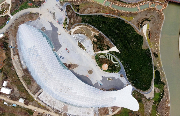 记者了解到,如果从空中俯瞰,可以看到一白一绿两条巨型“江豚”,一条是国际馆建筑,通体白色,另外一条是用植物打造而成,通体绿色,面积与国际馆相似。