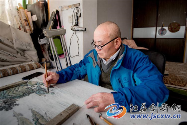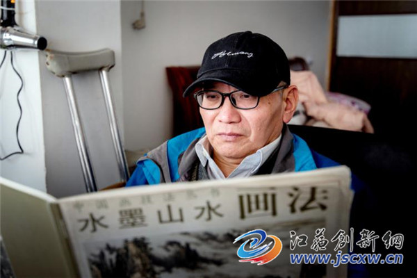 江苏创新网讯 饶祥兴,自幼患小儿麻痹症致下肢残疾。青年时期爱好国画山水,临摹《芥子园》画谱自习山水画。2013年被南京心动心文化传播有限公司录用,专职从事绘画工作,其作品多次参加公司举办的义卖、拍卖活动,受到社会各界的赞誉。