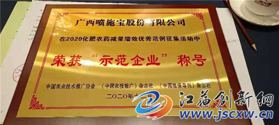 江苏创新网讯 5月9日,农业农村部中国农业技术推广协会、《中国农技推广》杂志社、《中国植保导刊》杂志社在北京隆重举办农业绿色发展论坛暨2020化肥农药减量增效优秀范例征集结果发布大会 ,广西喷施宝公司喜获“化肥减量增效优秀示范企业” 和“化肥减量增效创新产品”两项大奖 !农业农村部农技推广协会陈生斗会长和全国农业技术推广服务中心首席专家高祥照颁奖。