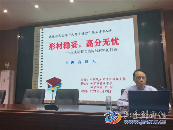 江苏创新网讯 近日,由句容市图书馆与民进镇江市句容支部联合主办的——民师大讲堂公益讲座在郭庄中学举行,民进句容支部主委裔胜东给毕业班全体学生和赤山湖文学社社员带来了精彩的作文讲座。