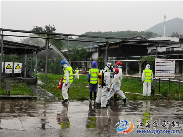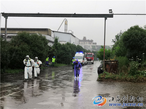 三时许,雨势忽然加剧,倾盆如注,面对突至的暴雨,演练丝毫未受影响,虽然各小组成员全身透湿,仍按预定方案紧张有序、有条不紊进行。与此同时,句容生态环境局接到情况汇报后立即启动应急程序并向镇江市局汇报,安排环境应急和监测人员第一时间奔赴现场积极响应。