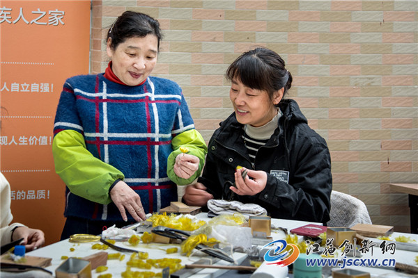 江苏创新网讯 武荣华,秦淮区苜蓿园社区残疾人专职委员,自幼患小儿麻痹症致下肢残疾。她热心为残疾人服务,主动担任街道残疾人手工坊老师,向身边的残疾朋友传教工艺品编结技能,搭建助残慈善的平台,受到了社会的认可。