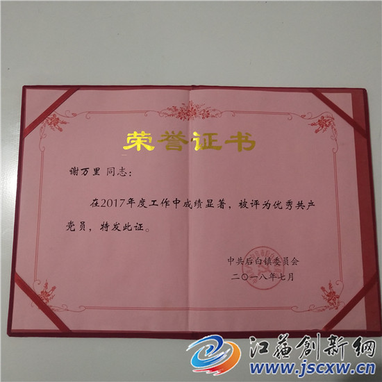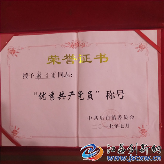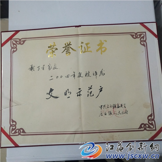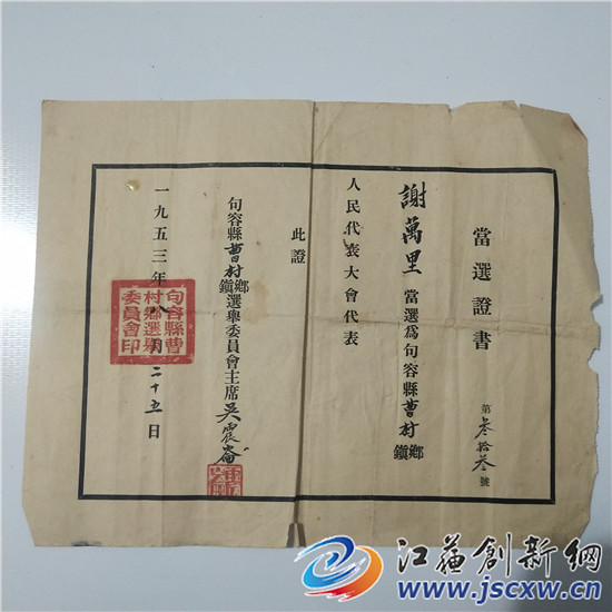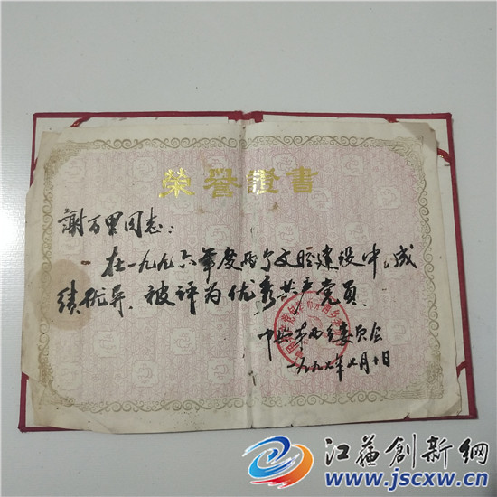 谢万里今年91岁的,1951年参加工作,1952年加入中国共产党。在谢老的家中,记者见到一张保存完好的1953年颁发给他的曹村乡人民代表大会代表当选证书,它见证着谢老年轻时的荣耀,同时还有谢老多年来获得后白镇党委表彰的“优秀共产党员”以及“文明示范户”“五好家庭”等各种荣誉证书。