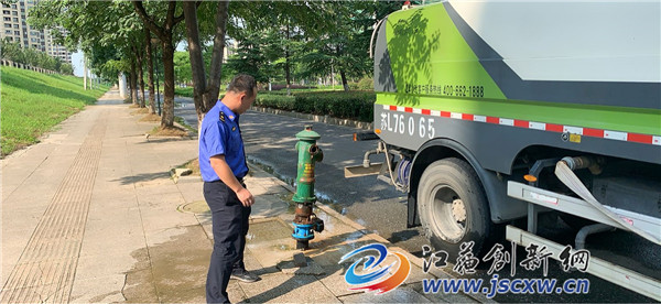 等待期间,句容市环卫处洒水车正巧路过,想着洒水车一般也是从消防栓取水肯定有专业工具,两人就拦下洒水车借来工具去关闭阀门,这才发现消防栓的阀门已经损坏,只有等水务集团专业人员来维修。看着白花花的自来水不断的往外流,为了避免水资源的过多损失,城管队员建议洒水车先进行装水,一边装水一边等待水务集团工作人员。20分钟左右,水务集团工作人员到达现场,对消防栓进行了紧急维修,漏水现象得到修复。