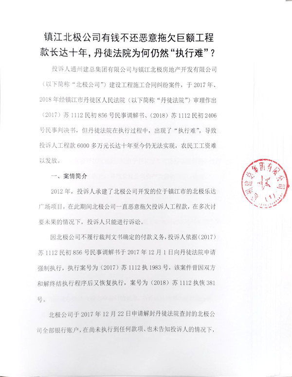 2012年,投诉人承建了北极公司开发的位于镇江市的北极乐达广场项目,在此期间北极公司一直恶意拖欠投诉人工程款,在多次讨要未果的情况下,投诉人只能进行诉讼。