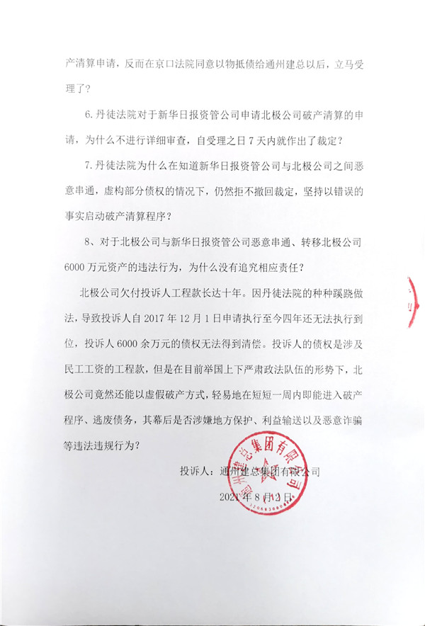2021年3月12日,京口法院告知投诉人,其已经同意投诉人以物抵债的申请,但需向镇江中院汇报后方可出具正式的执行裁定书。2021年3月22日,新华日报资管公司以并不存在9000万元到期债权向丹徒法院申请对北极公司破产清算,北极公司在完全知晓新华日报资管公司没有9000万元的到期债权情况下认可该债权并同意破产清算。丹徒法院并未详细审查就在3月29日即7日内就裁定受理北极公司的破产清算案件,丹徒法院明显未尽到依法审查的义务,导致投诉人无法进行以物抵债。