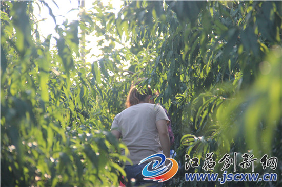 刘家桃园的主人刘士银和刘京父子对记者介绍到,桃子还没熟,纸套还没摘下,溧阳一家水果店老板,就慕名联系他们,在手机上转账7000元作为定金,要求预定3000斤桃子。生态桃园盛产的“秋红一号”脆桃正式开园采摘消息发布后仅4-5天,南京、无锡、常州、镇江的很多老顾客闻讯纷纷开始网上和电话预订抢购。正好遇到好天气,很多游客携朋友携家人前来园区采摘,享受采摘乐趣。刘士银欣喜地说,今年是个好年景,阳光充足,雨水少,桃园产量比去年高,总产量超过二十万斤。没想到,开园没几天,前来采摘的人员好几千人,桃子采摘已经超过三分之一。正是因为采摘异常火爆,前面桃子采完了后面桃子还没空套袋,桃园里还有12-13万斤的脆桃等待市民和游客前来采摘和购买。
