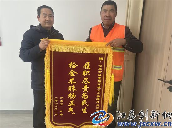 1月29日下午,李先生专程来到句容市环境卫生管理处,将一面印着 “履职尽责为民生 拾金不昧扬正气” 的锦旗送到贡成荣手中。他紧紧握住贡成荣粗糙且布满老茧的手,连声道谢,称赞他是当之无愧的“诚信使者”。贡成荣黝黑的脸上露出憨厚的笑容,朴实的话语格外动人:“拾金不昧是本分,帮失主解决难题比啥都强。”