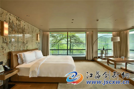 酒店视野开阔,几乎每个客房都有无敌观光露台,尤其顶层的揽空台,更是360度的景观视野,是观景赏月之绝胜处;东有始信峰,西有丹霞峰,面向贡阳山,天高地阔,翠拥螺环;建筑上的玻璃幕墙有如“山镜”,将自然光景尽收其中,不同时节产生不同变幻,构建出一处身心共养的狮子林中福地。
