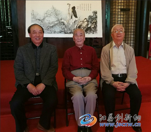 (上图:著名画家、“军中一枝梅” 张永荣(左)、姚老(中)、天津书画名家彭连熙(右),下图:三人共同创作的精品巨作《陆游扶梅图》)